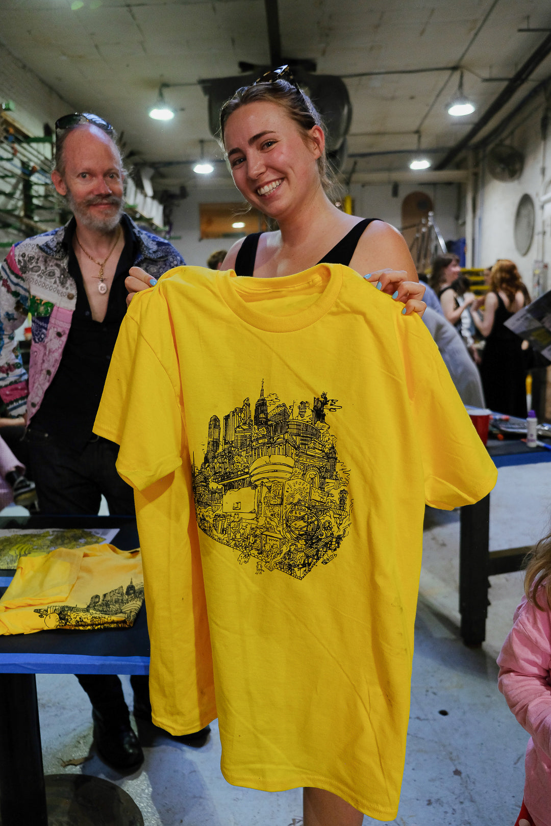 At last month’s launch for issue #45, we teamed up with screen printer Francis Ohe to create special T-shirts live in front of partygoers using Sean Suchara’s cover illustration: a fantastical future intersection where Piranesi comes to Broadway as New York crumbles. You probably saw on social media that the shirts were a hit, becoming the fashion must-have in East Williamsburg (for a couple hours in early May, at least). Demand has been diluvian since.